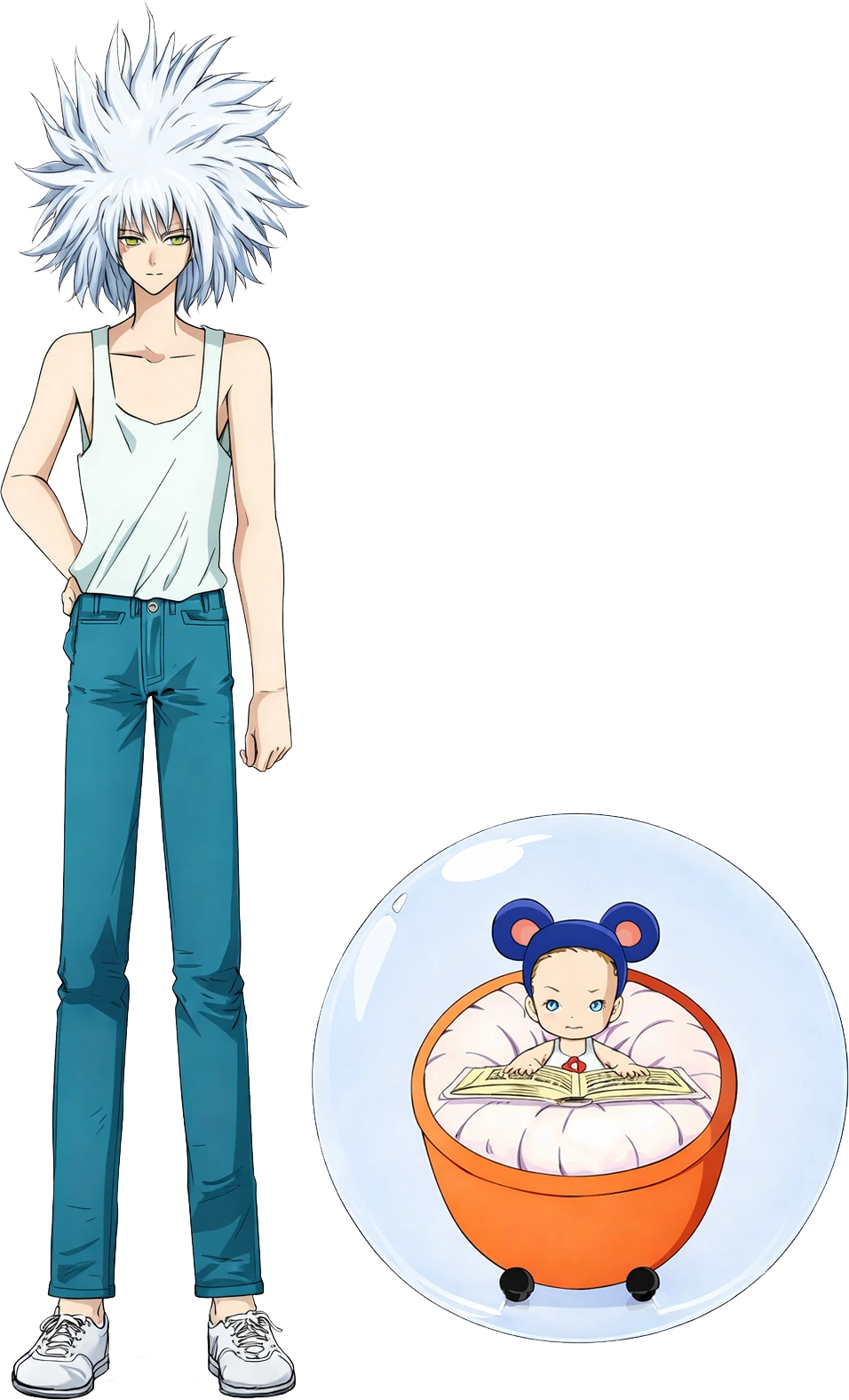 Clear Note is a striking and ominous Mamodo with a towering presence and a chaotic aura. He has extremely tall, lean proportions and sharp, angular features. His most defining visual trait is his wild, spiked white hair, which fans out explosively in all directions—giving him a volatile, untamed look that matches his destructive nature. His outfit is simple but stark: a white tank top and teal-blue jeans, giving him a casual, almost deceptive appearance that belies his terrifying power. He also wears grayish sneakers. His pale skin and cold, indifferent facial expression reinforce his role as a major antagonist, and his eyes—usually depicted with minimal detail—carry a chilling emptiness. Everything about Clear Note’s design exudes danger, unpredictability, and sheer overwhelming strength.