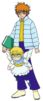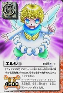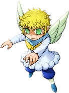 Erujo is a small and childlike angel-looking Mamodo, with bright blonde, curly hair and a pair of large, white wings extending from his back. His outfit is whimsical and celestial, featuring a fluffy, white dress adorned with yellow accents and decorative elements, enhancing his angelic appearance. Erujo has green colored eyes.