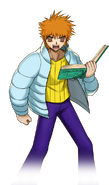 Francoise is tall and lanky with a nonchalant demeanor. He has spiky orange hair and wears a modern outfit consisting of a light blue puffer jacket over a yellow sweater and blue pants.