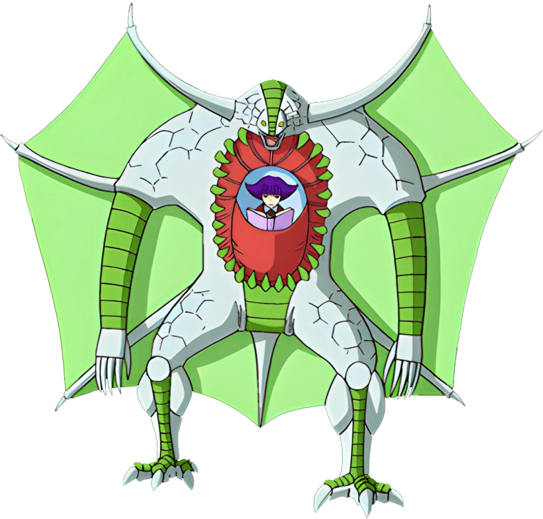 Jedun is a massive, dragon-like Mamodo with a humanoid build but beastly proportions. His skin is pale and cracked in texture, resembling stone or scales, with segmented green armor-like plating running along his arms, legs, and underbelly. He has large, membranous green wings that stretch from his back, giving him a batlike silhouette. Jedun’s body is bulky and muscular, supported by clawed feet and hands tipped with sharp talons. His most distinct feature is a large, red cavity in his chest resembling a maw lined with jagged, tooth-like structures. Inside this cavity rests his human partner.