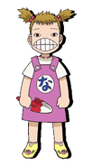 Naomi is a tall girl for her age with long blonde hair styled into two pigtails and a distinctive swirling fringe across her forehead. Her outfit typically consists of a white T-shirt worn beneath a pink dress decorated with blue Japanese writing on a white background, paired with yellow sneakers, giving her a lively and playful look. Her biggest noticeable feature is that she always grits her teeth.