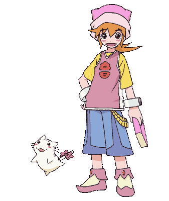 Shion is a cheerful young girl with an energetic and bright appearance that matches her upbeat personality. She has orange hair tied into a short side ponytail and wears a pink cap with a white rim. Her outfit consists of a pink sleeveless shirt over a yellow undershirt, blue knee-length shorts, and pink-and-yellow boots with heart motifs. She accessorizes with white wristbands.