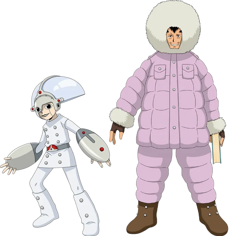 Ruku is an older man wrapped in a pale pink parka with a fluffy hood. He wears matching brown gloves and boots. He has a curly moustache and widow's peak, as well as noticeable wrinkles on his face.