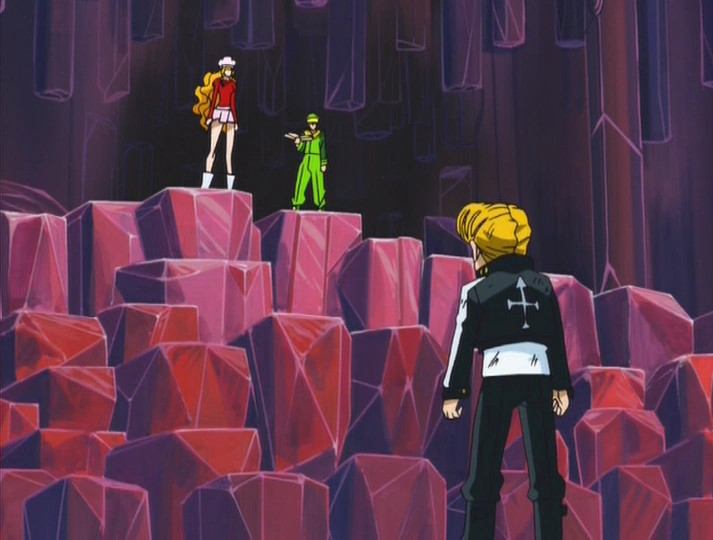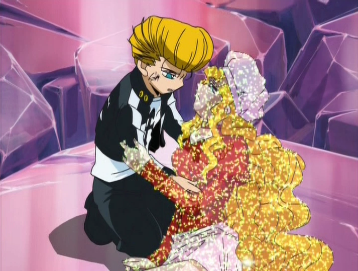 Back in the present, Ted tries once more to convince Cherish that he wasn’t the one who attacked her family. She refuses to believe him, but Ted finally tells her that she has always been the most important thing to him, something she should already know. Stunned by his words, Cherish orders Nicole to cast their strongest spell. Nicole unleashes Dioga Kofarudon, but Cherish intentionally aims it just off to the side of Ted. Overcome with emotion, Cherish falls to her knees, remembering Ted’s promise long ago that he would protect her in the battle. Ted embraces her, and at last, Cherish accepts that he truly cared for her. Watching from the control room, Riou, disappointed with this outcome, activates the trap he had prepared. The room violently shakes as Faudo’s Heart Guardian appears and captures Nicole.