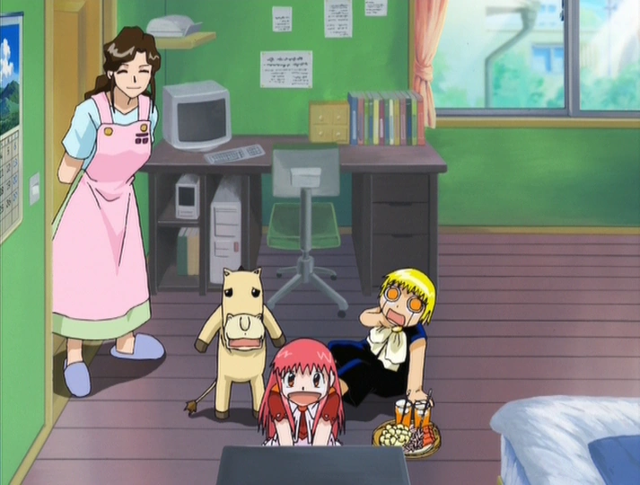 Later at Kiyo’s house, Elle shares her story with the group. She explains that she has no desire to fight and has been traveling the world to spread peace. The kids tell her they also avoid fighting when they can, adding that Kiyo, Zatch’s bookkeeper, is a good person. Just as Elle begins to feel reassured, Kiyo storms into the room, still furious after being shoved into the river, and demands Zatch come outside to battle the Mamodo who attacked him earlier. Realizing he means Momon, Elle panics, and before she can explain, they spot Momon peering at them from outside the glass door. Elle tries to quietly signal him to leave, but he’s quickly noticed by Kiyo. Momon flees, with Kiyo and the others chasing after him.