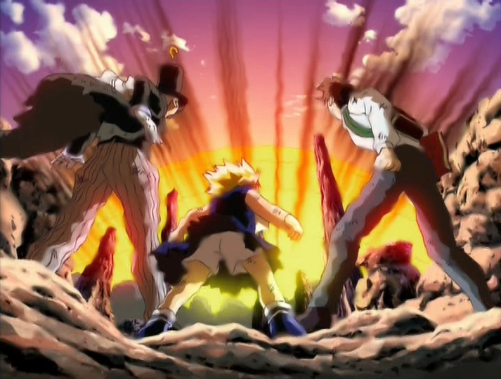The battle then begins as Zofis attacks Zatch using multiple Radomu shots but Zatch easily handles the blow of each spell with just his body. Zofis then resorts to using Gigano Radomu to attack them next. To protect Zatch, Wonrei, Laila, and Tia all put their strength into their respective shield spells to stop the attack. When Zofis sees his attack stopped thanks to all of their efforts, he then notices Kanchome, in a transformed state using Poruku, slingshot Zatch, Kiyo, and Ponygon into the air towards Zofis. Zofis would try multiple times to stop them in their pursuit but all three of them continue to prevail in enduring his attacks. They follow Zofis through the sky until Zofis reaches the ground expecting the three of them to have run out of any strength from within to attack. To his surprise, the three of them continue to follow him. As Ponygon leads them to Zofis, Kiyo grabs Zatch and throws him towards Zofis. The episode then suddenly ends as it focuses on Zofis’ reaction to this.