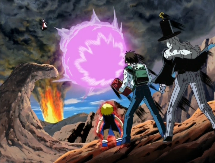 As Zofis agrees to face them all in battle, Koko casts Dioga Teoradomu and Zofis aims this spell at a nearby volcanic crater. The ground beneath everyone would begin to shake violently as the spell had triggered a volcanic eruption causing volcanic plumes of smoke and magma to spew from the crater. Zatch and his allies are then forced to run and hide behind large rocks to protect them from the magma and rocks that were now raining down onto the battlefield. Using the situation to his advantage, Zofis begins destroying the large rocks that were flung into the air using Radomu to create more fiery rocks to rain down on the area below him. As Zofis once again declares another victory for him, Zatch and Kiyo emerge from the rubble of the rocks as they are still determined to fight him as they refuse to let the sacrifices and feelings of those they cared about go to waste.